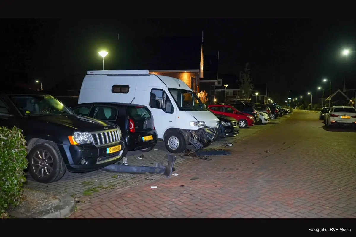 Een automobilist verloor daar door nog onbekende oorzaak de macht over het stuur en botste vervolgens tegen een geparkeerde camper en een personenauto aan, waarna de auto tot stilstand kwam tegen een lantaarnpaal. De automobilist is er vervolgens vandoor gereden met zijn beschadigde voertuig.