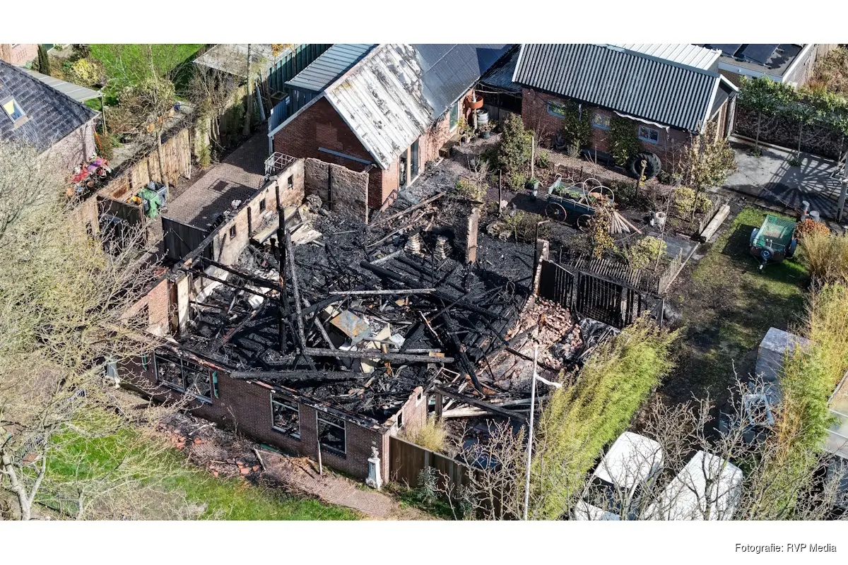 UPDATE 13.00 uur: Nieuwe beelden met een drone gemaakt bij goed daglicht. Het perceel is door hulpdiensten afgezet met lint 'gevarenzone niet betreden'.