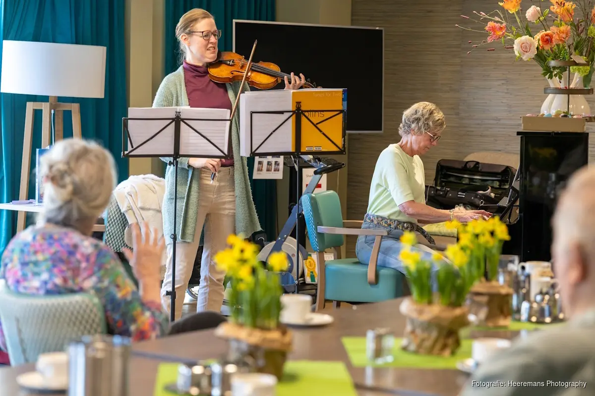 Donderdag 9 april werden de bewoners van woonvoorziening De Hulst in Oterleek verrast met een optreden. Dit keer kwamen Bianca Ijdema (docent accordeon) en Marleen Zoutman (docent viool) langs met een muzikaal programma. De bewoners van De Hulst houden van muziek, en dat was goed te merken aan het enthousiasme tijdens het optreden. Marleen en Bianca speelden weer een divers en verrassend repertoire, en genoten ook zichtbaar van het spelen voor deze mensen.