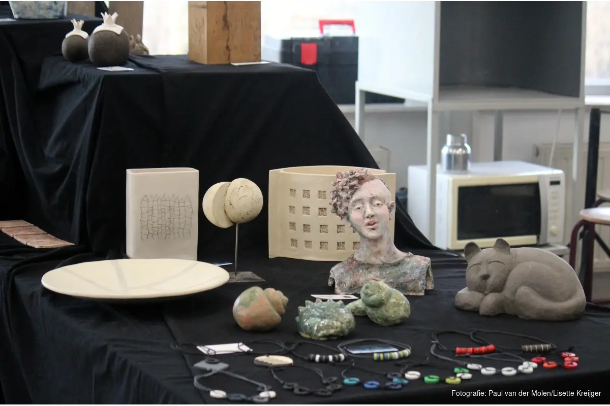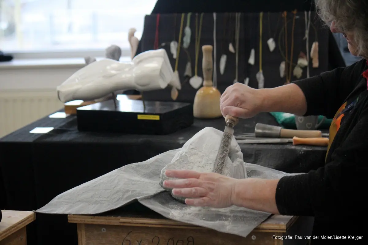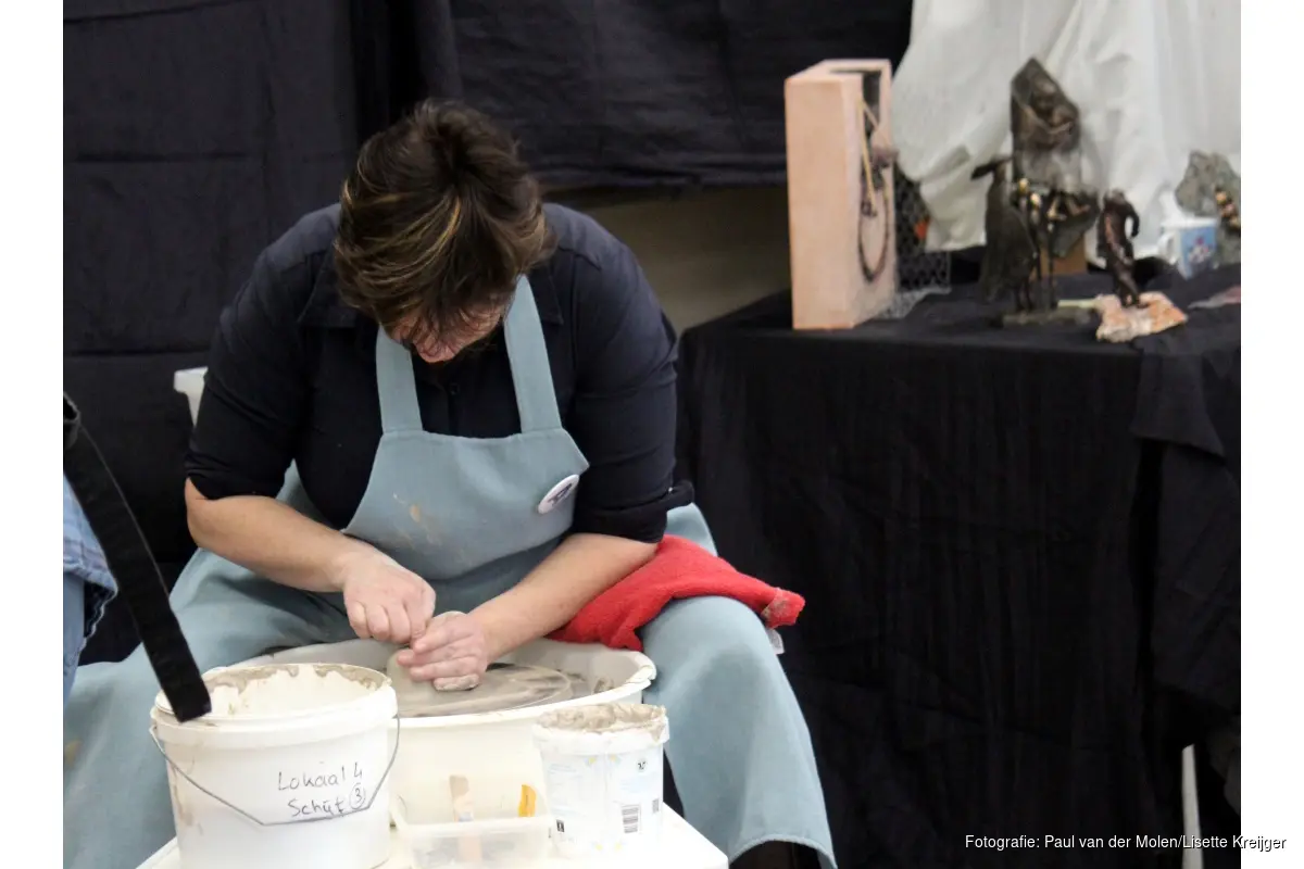 Schilderen/tekenen (surrealistisch, realistisch of intuïtief), grafische technieken zoals linoleumdruk of houtsnede, fotografie – lightroom CC en Tiffany: om maar een greep te doen uit het aanbod. Wil je leren quilten? Lijkt het je wat om een roofvogel te maken in een legering van lood en tin? Of denk ook eens aan iets schrijven in kalligrafieschrift: “Kalligrafie stamt uit vroege beschavingen en is duizenden jaren oud, ook in oude manuscripten gebruikt”, zo weet letterkunstenaar Margreet Wanst te vertellen. Keramist Pauline Kokmeijer vult aan: “Pottenbakken is sinds corona écht booming. Het is de populairste cursus!” Bezoeker Cor ziet zijn kans schoon en maakt kennis met deze discipline. “Heel leuk om dat eens daadwerkelijk te proberen, met tips van een ervaren pottenbakster”, zegt hij. Kortom: van oude ambachten tot modern fotografiewerk. Chat GTP, daar zijn ze hier niet zo van, het wordt slechts gebruikt als hulpmiddel.